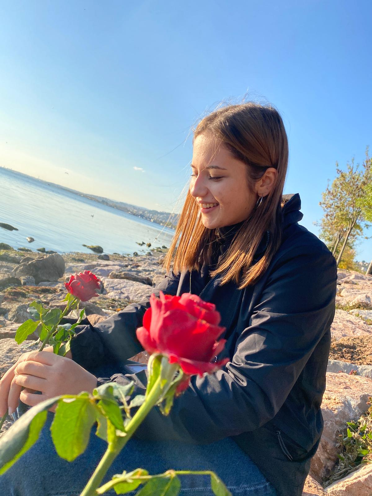 Sana aldığım ilk çiçek. İkimizde kendi çiçeğimize bakıyoruz.